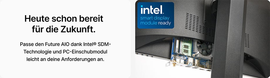 Der FutureAIO besitzt eine Schublade auf der Unterseite, in dem der PC in Form eines einfach aufzurüstenden Moduls eingeschoben ist. Es gibt hier einen internationalen Standard: Intel's SDM (Smart Display Module). SDMs gibt es von verschiedenen Herstellern mit allen denkbaren CPU Generationen und Ausbauformen.