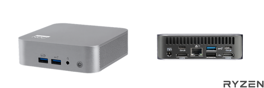 Anthracite mini PC, magnesium case 112 x 112 mm, height 37 mm. AMD Ryzen CPU with up to 5.2 GHz and 8 cores.